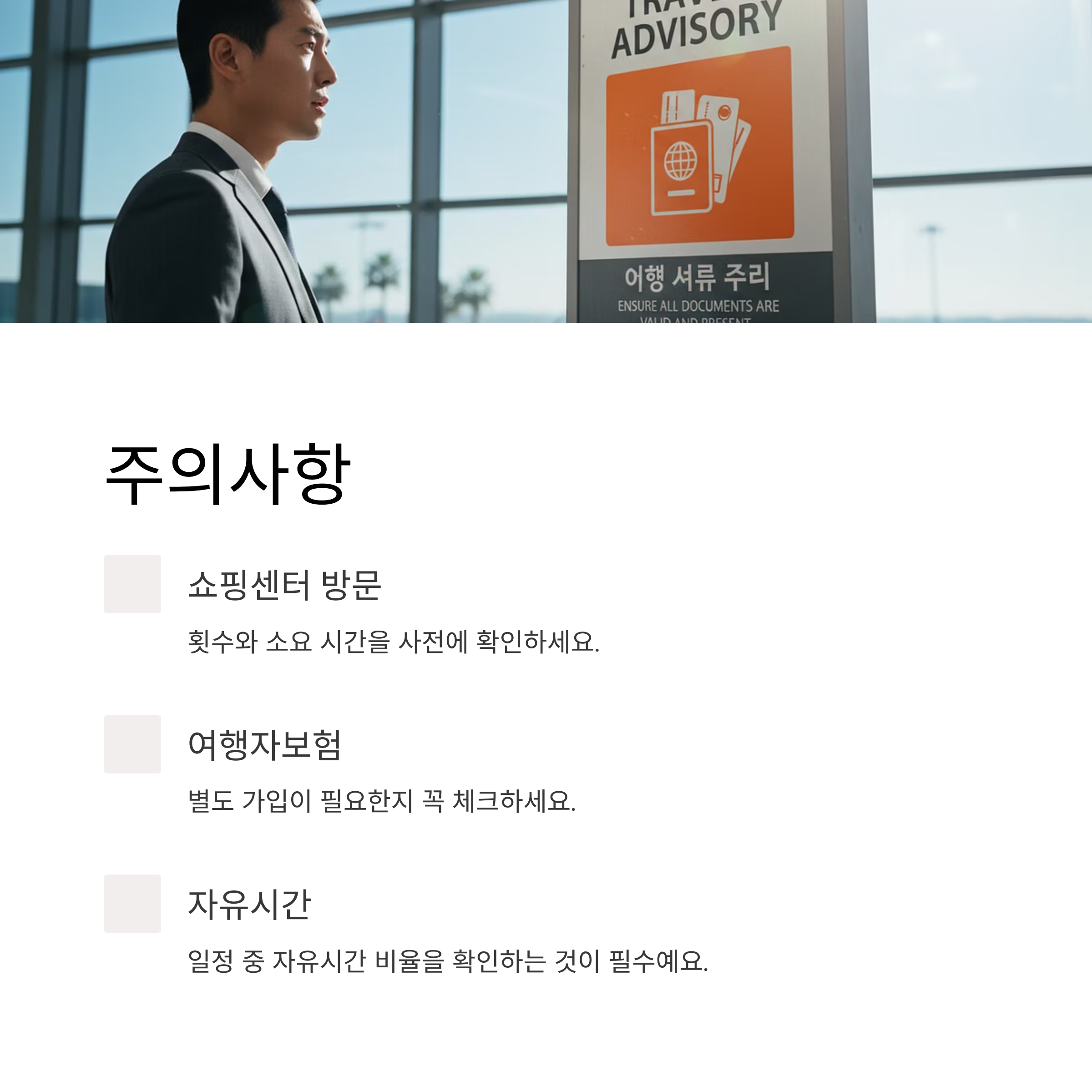 | 현지 쇼핑 최소화 | 가이드 추천 상품보다 미리 검색해두기 |