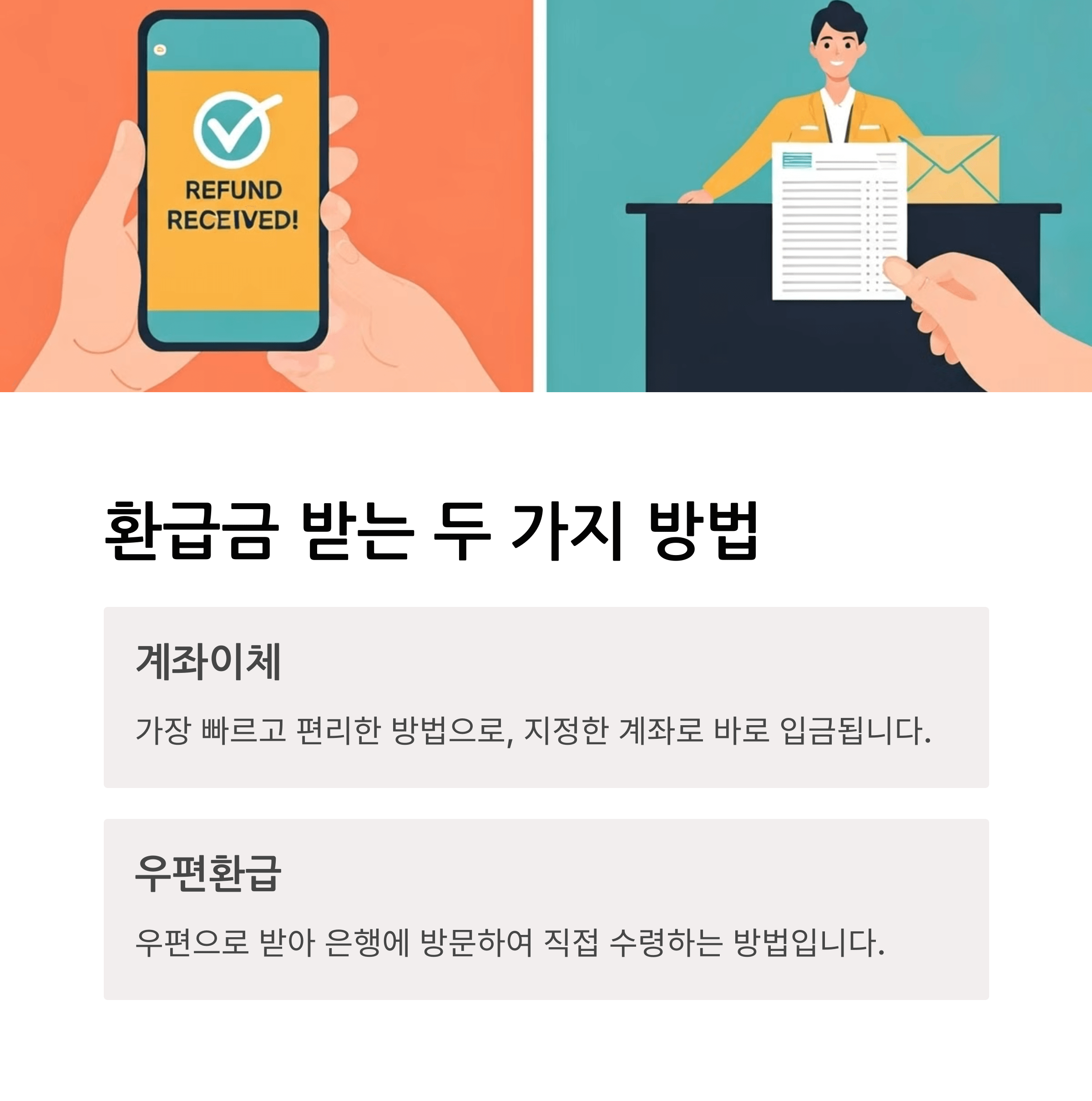 지급 방법은 계좌이체 or 우편환급 두 가지입니다!