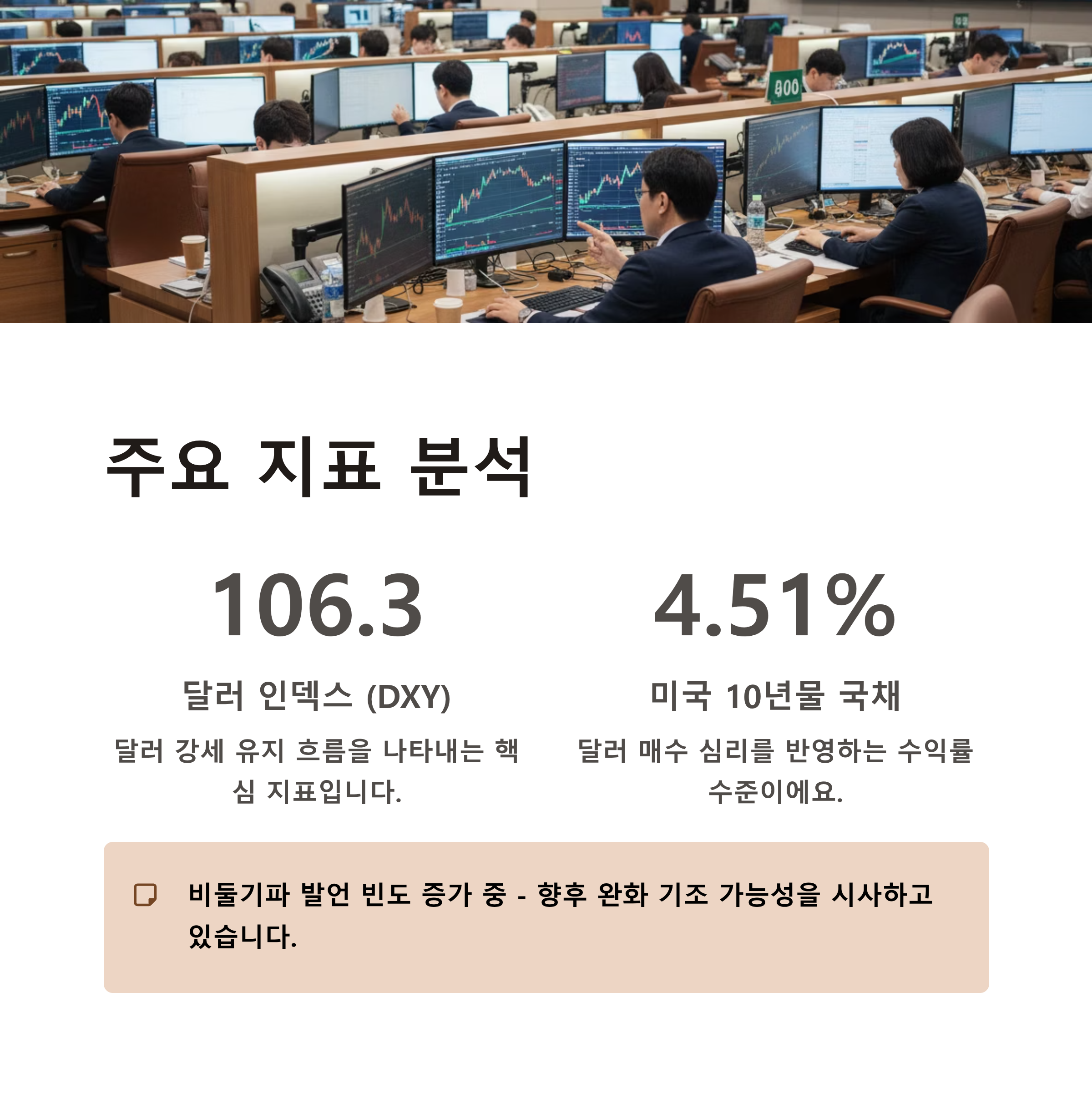 | 달러 인덱스 (DXY) | 106.3p | 달러 강세 유지 흐름 |