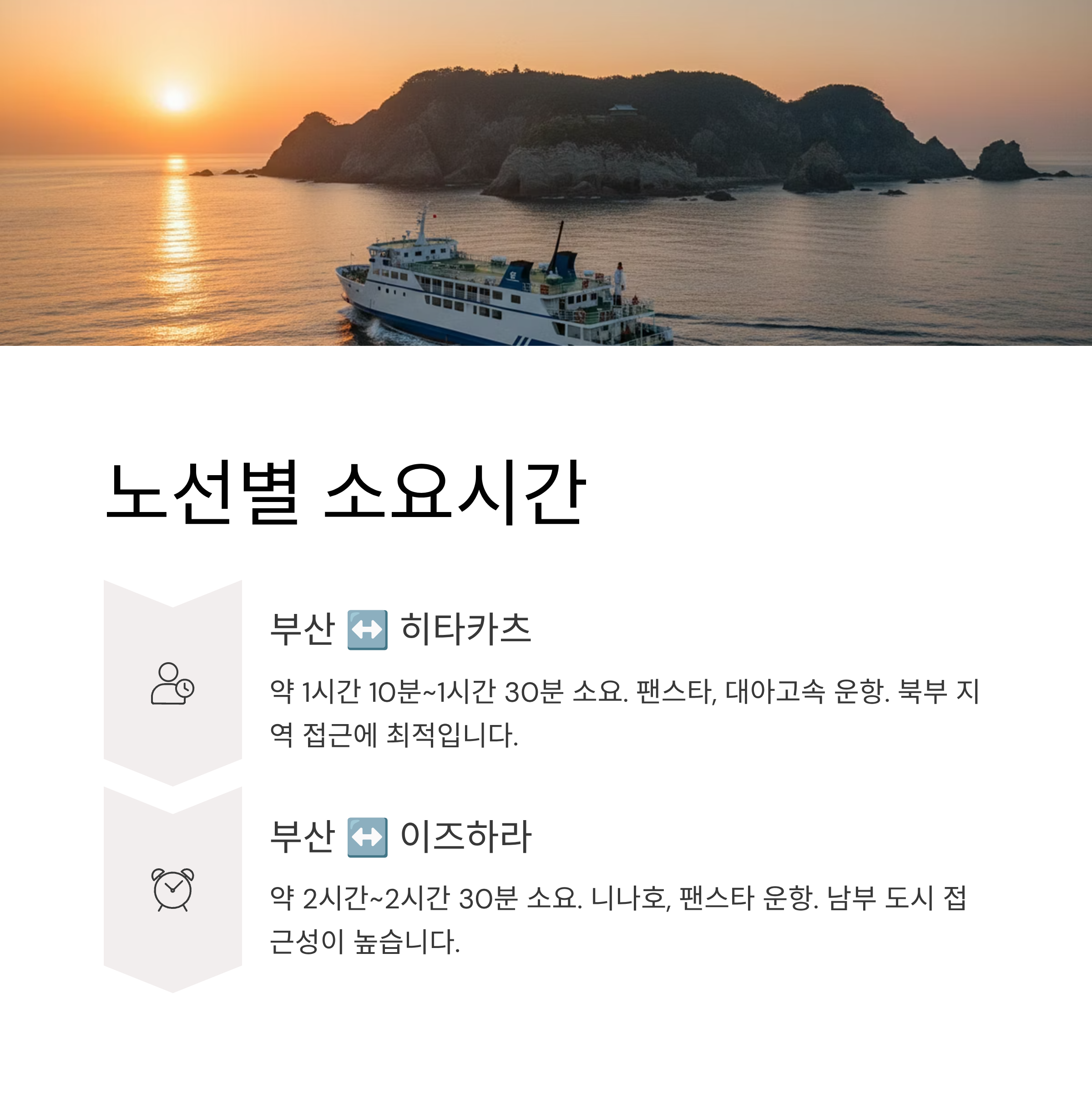 | 부산 ↔ 이즈하라 | 약 2시간~2시간 30분 | 니나호, 팬스타 |