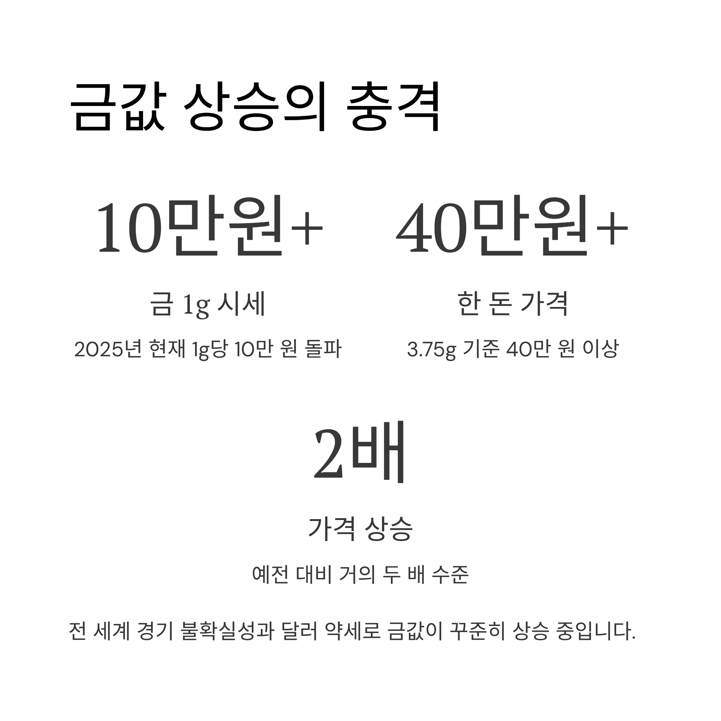 특히 돌반지는 ‘한 돈’ 단위로 가격이 매겨지기 때문에, 금값이 오르면 가격도 덩달아 뛸 수밖에 없어요.