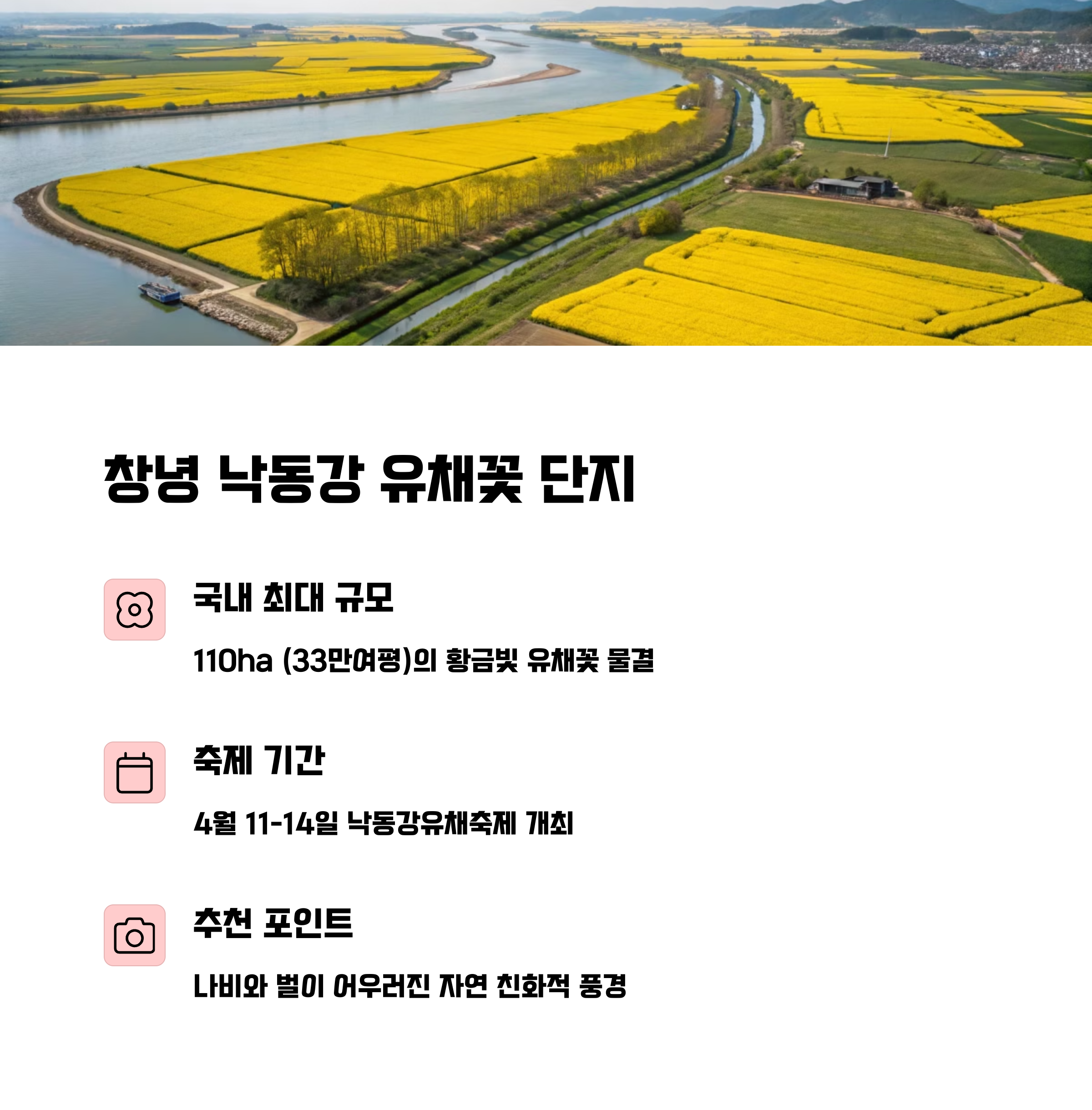창녕 유채단지는 강 따라 쫙 펼쳐진 노란 꽃밭이 예술이에요.