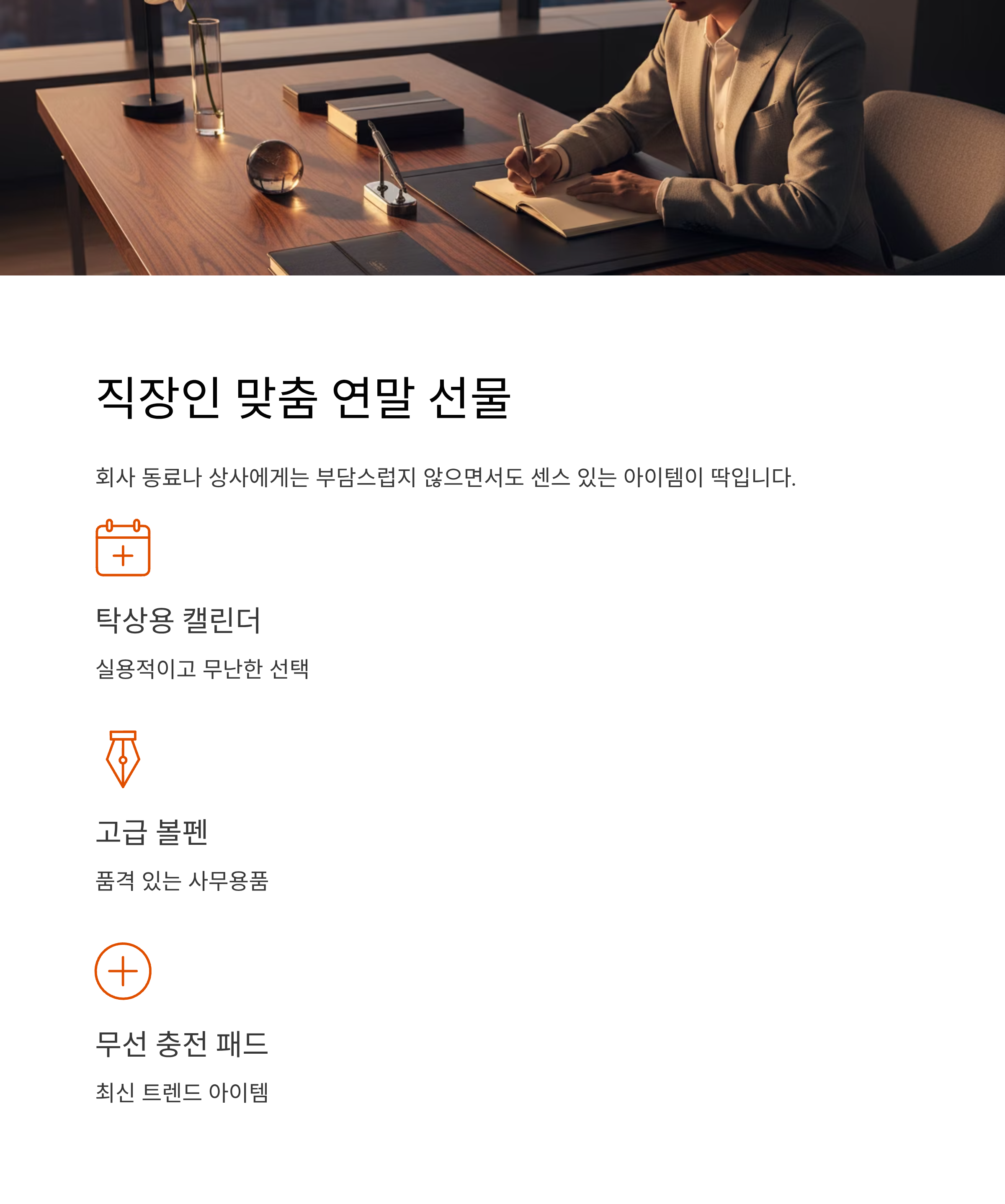 특히 탁상용 캘린더, 고급 볼펜, 무선 충전 패드 같은 제품들이 인기랍니다.
