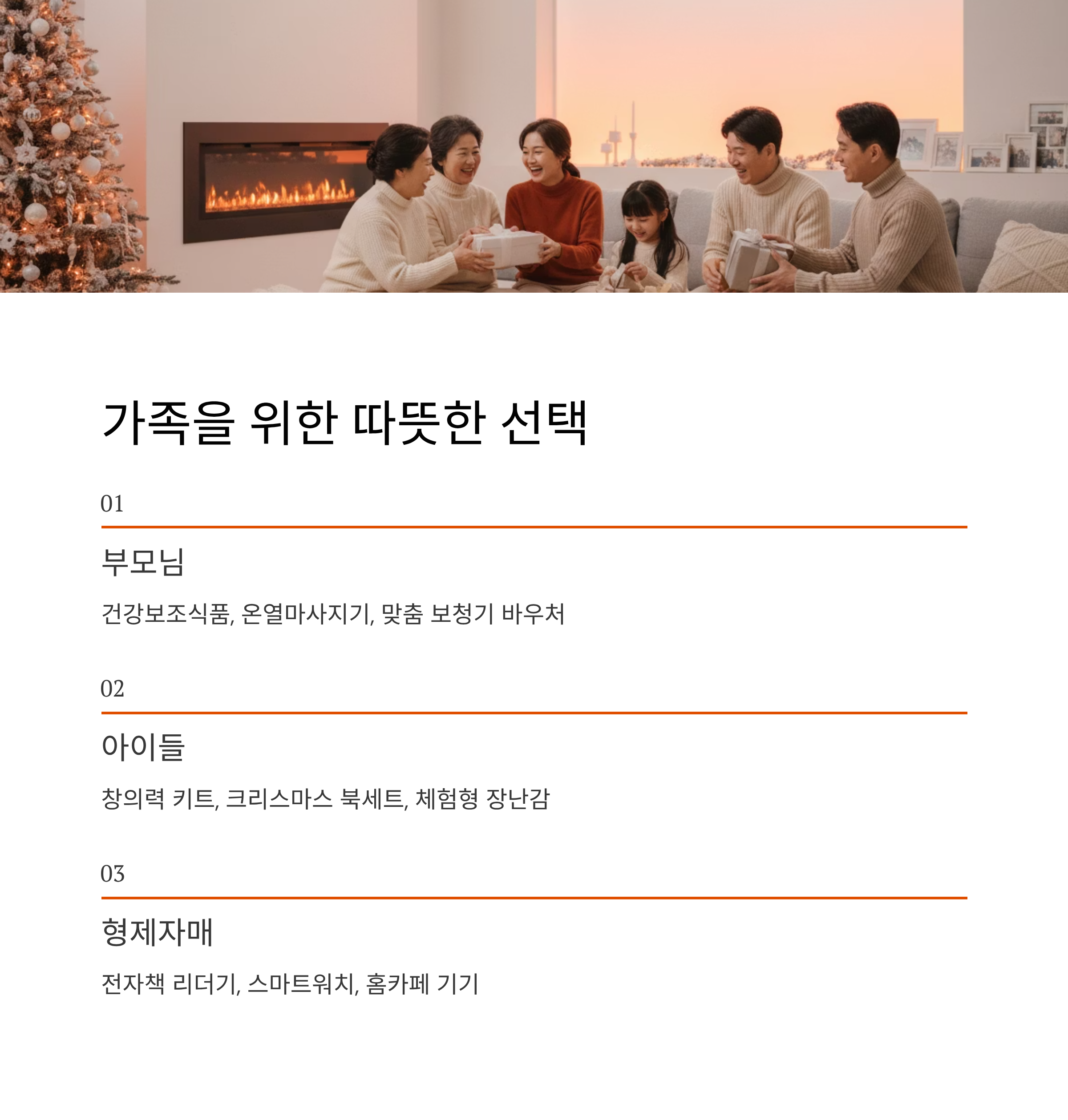 가족에게는 단순한 ‘물건’보다 마음을 담은 선물이 중요하죠. 다음은 가족 구성원별로 인기 있는 아이템 리스트입니다.
