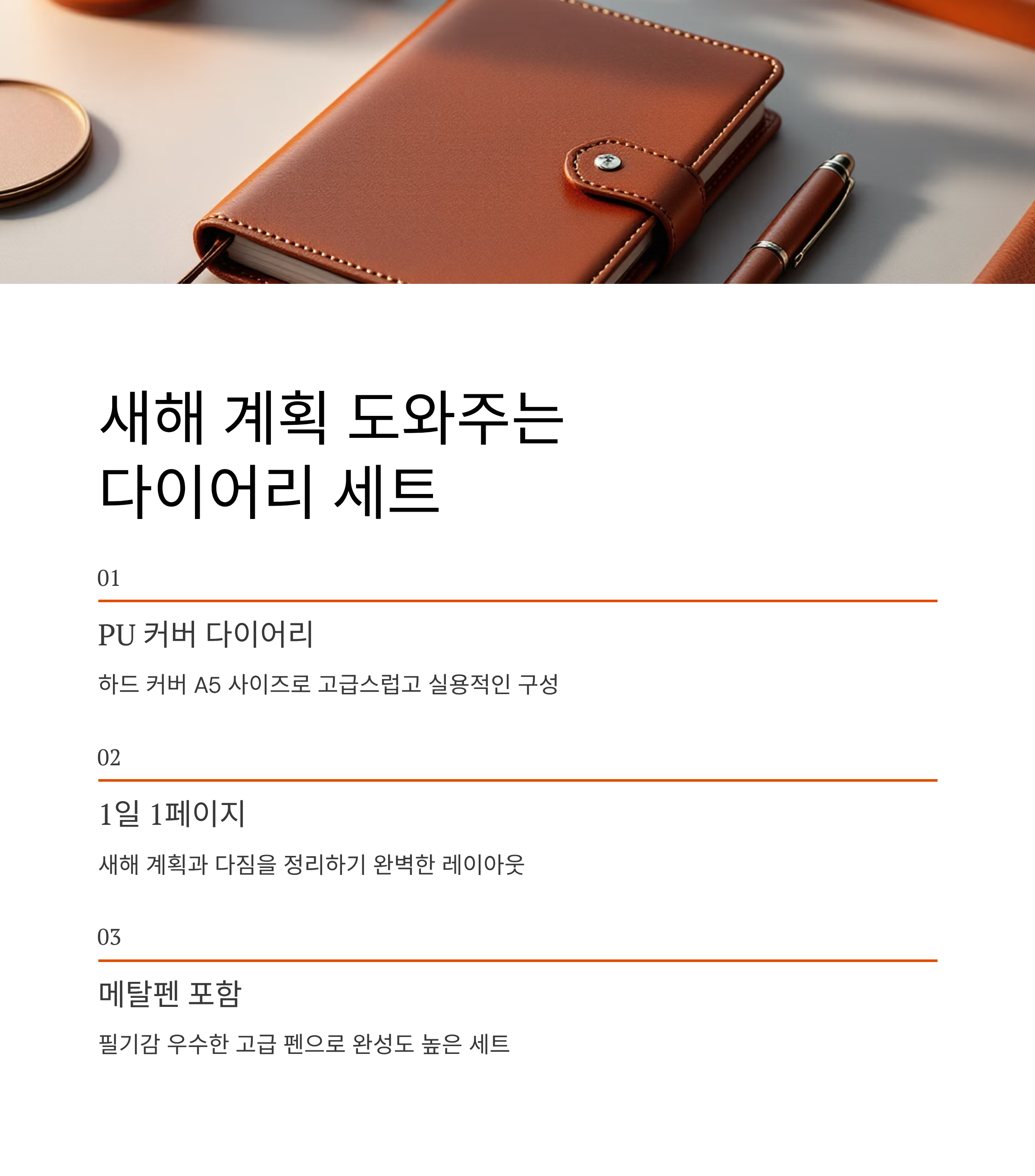 | 심플 가죽 다이어리 | 하드 커버, 1일 1페이지 구성 | 계획 정리 용이, 선물용 적합 |