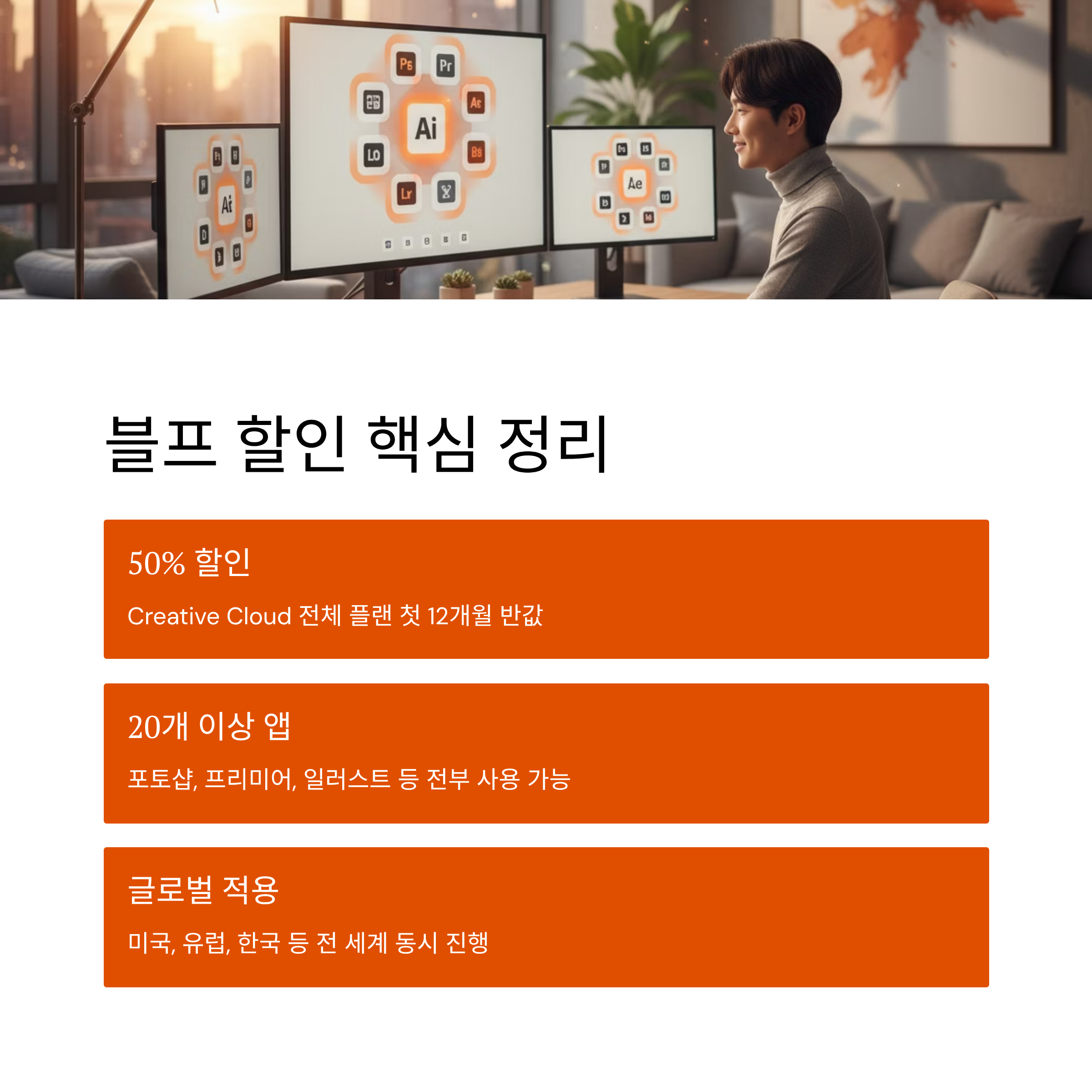 그런데 올해는 진짜 실속 있는 딜이 나왔더라구요. 특히 Creative Cloud 전체 플랜이 50%나 할인되는데,