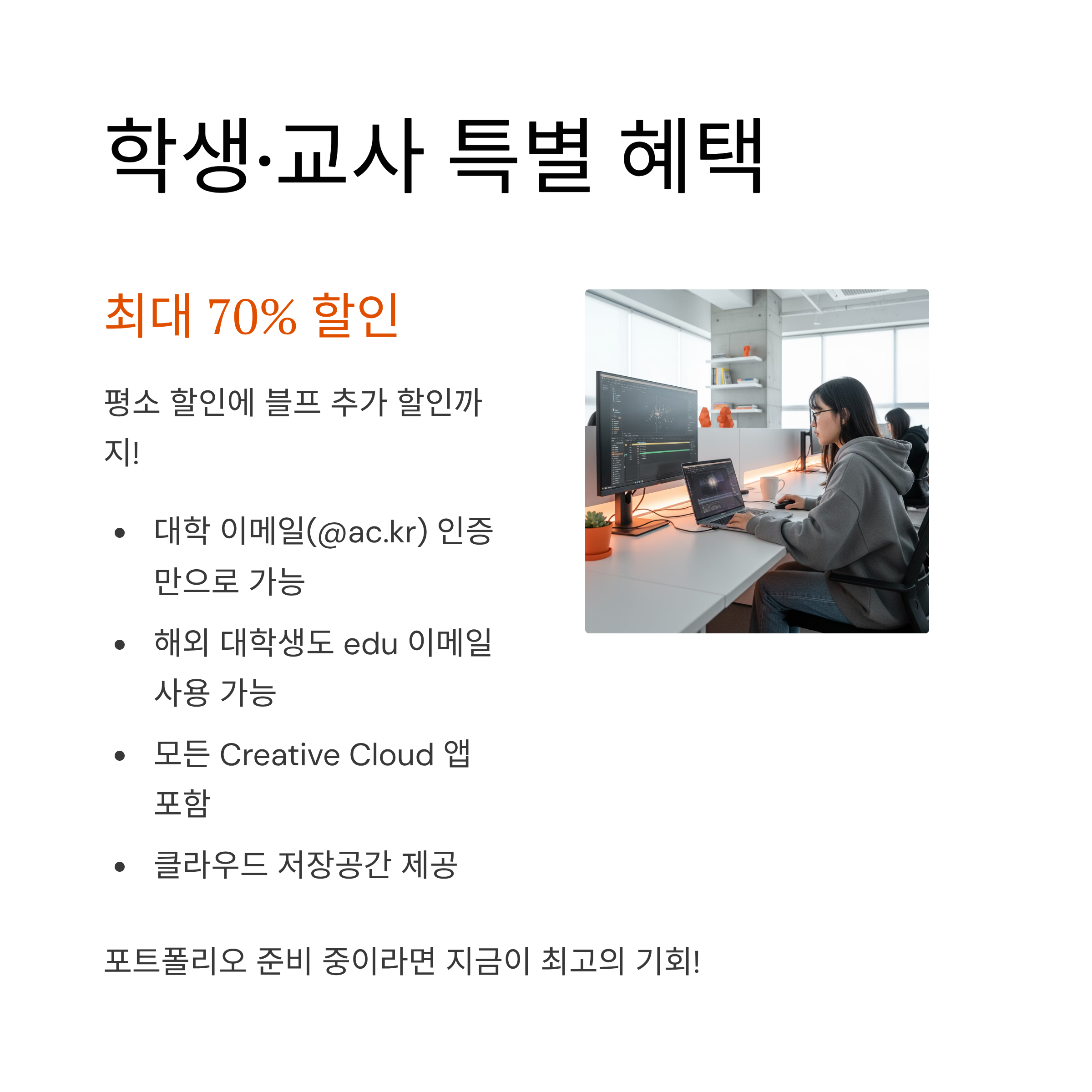 | 학생/교사용 All Apps | ₩22,000/월 | ₩16,500/월 | 약 70% 할인 적용 중 |