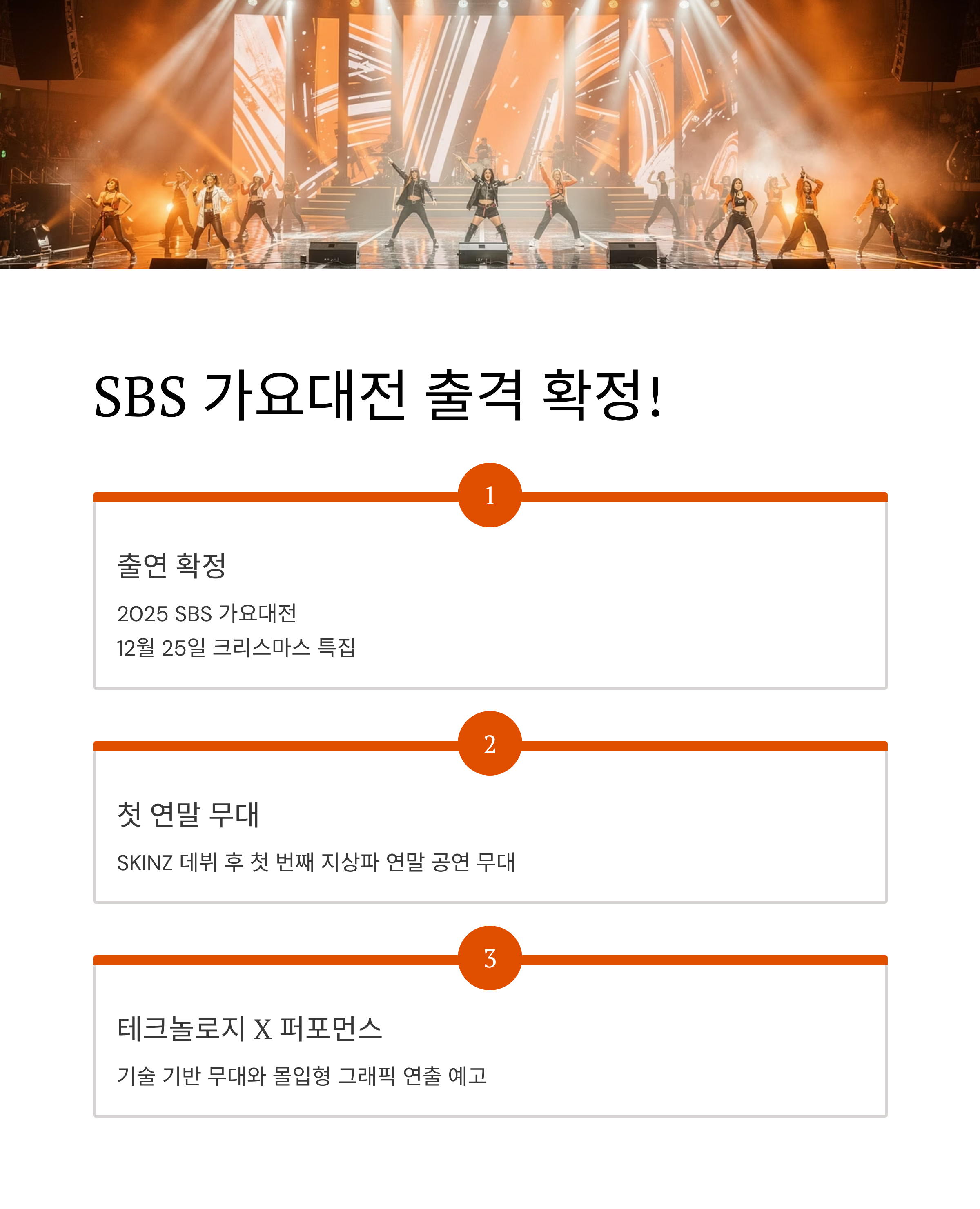 | 2025 SBS 가요대전 | 12월 25일 | SKINZ 데뷔 후 첫 연말 무대 출연 |